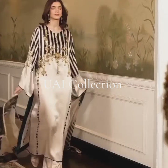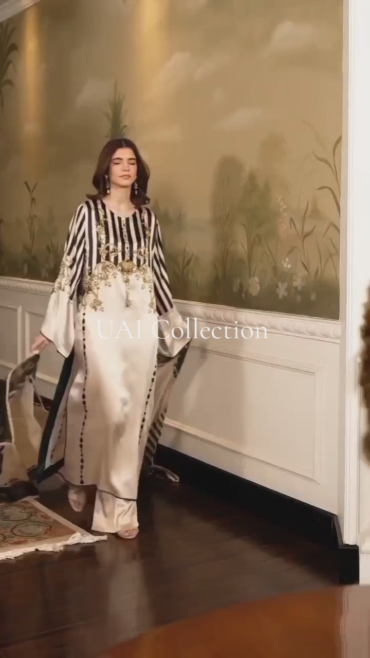 This top made in ivory soft charmeuse silk fabric in striped ornamental print features crew neckline with crystal embellishments and tassels on front, full length flared sleeves, square armholes and side slits.
